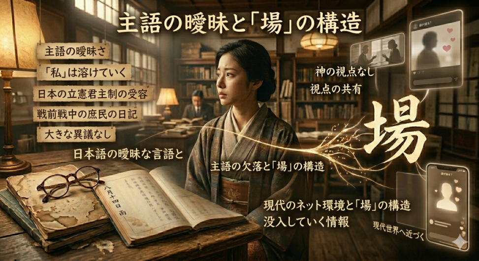 私は若い頃から、日本語には主語がない、あるいは主語を明示しなくても成立してしまうことに違和感を持ってきた。その違和感は、単なる言語の特徴ではなく、日本の社会や政治のあり方とどこかでつながっているのではないか、という感覚として残っている。